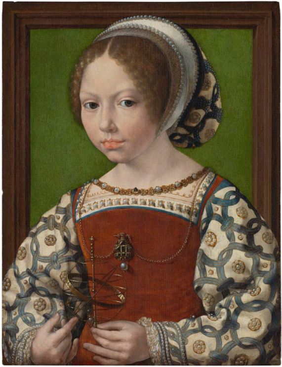 In contrast to this constant movement, however, there is a moment of extraordinary spatial stability in the painting, albeit presented with irony: a point where the eye becomes stilled by the unusual. Dorothea, if indeed that is who she is, holds an armillary sphere in her left hand and points to it with her right forefinger. These three-dimensional spherical models of the celestial bodies have a long history and were not especially novel in the sixteenth century, but they did take on some engineering refinements as tools became more sophisticated and aesthetic considerations were mixed with scientific descriptions. Usually, armillary spheres comprised metal hoops corresponding to the orbit of particular heavenly bodies, in the centre of which was the Earth, at least in Ptolemaic spheres such as the one depicted in the painting.13 The girl holds the sphere upside down and is pointing to the 55th latitude north of the equator; some have suggested that this inversion is a deliberate commentary on the kingdoms lost to Denmark. Certainly, Gossaert used the armillary in the painting self-consciously since he altered some of the bands and replaced the signs of the zodiac that usually appear on one of them with letters that might be intended as an anagram of his own name (although there are some unexplained extra letters and some omissions).14 Like the single hair in The Elderly Couple, this amended labelling of the star signs with a wilfully obscure version of the artist’s name places him as a wry and disruptive presence in the conceit of an engineered version of the universe. If there are some doubts as to the identity of the sitter, the intention of the inversion of the armillary sphere and why she might be pointing at 55 degrees north, there can be little doubt that she is holding something that is very much like a three-dimensional model of the universe, and that she is also outside that model gesturing to a point on the inside: a miniature God(dess), resting on the eighth day, pointing to an important local highlight.