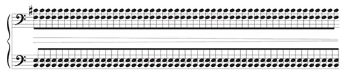 When I am ready to play Piano Piece 9, I position my hands a half-inch above the four notes of the chord, B, E, F, C♯. I hit the keys as hard as I can, punching down with my fingertips. The first measure is exactly one hundred and sixteen beats long.